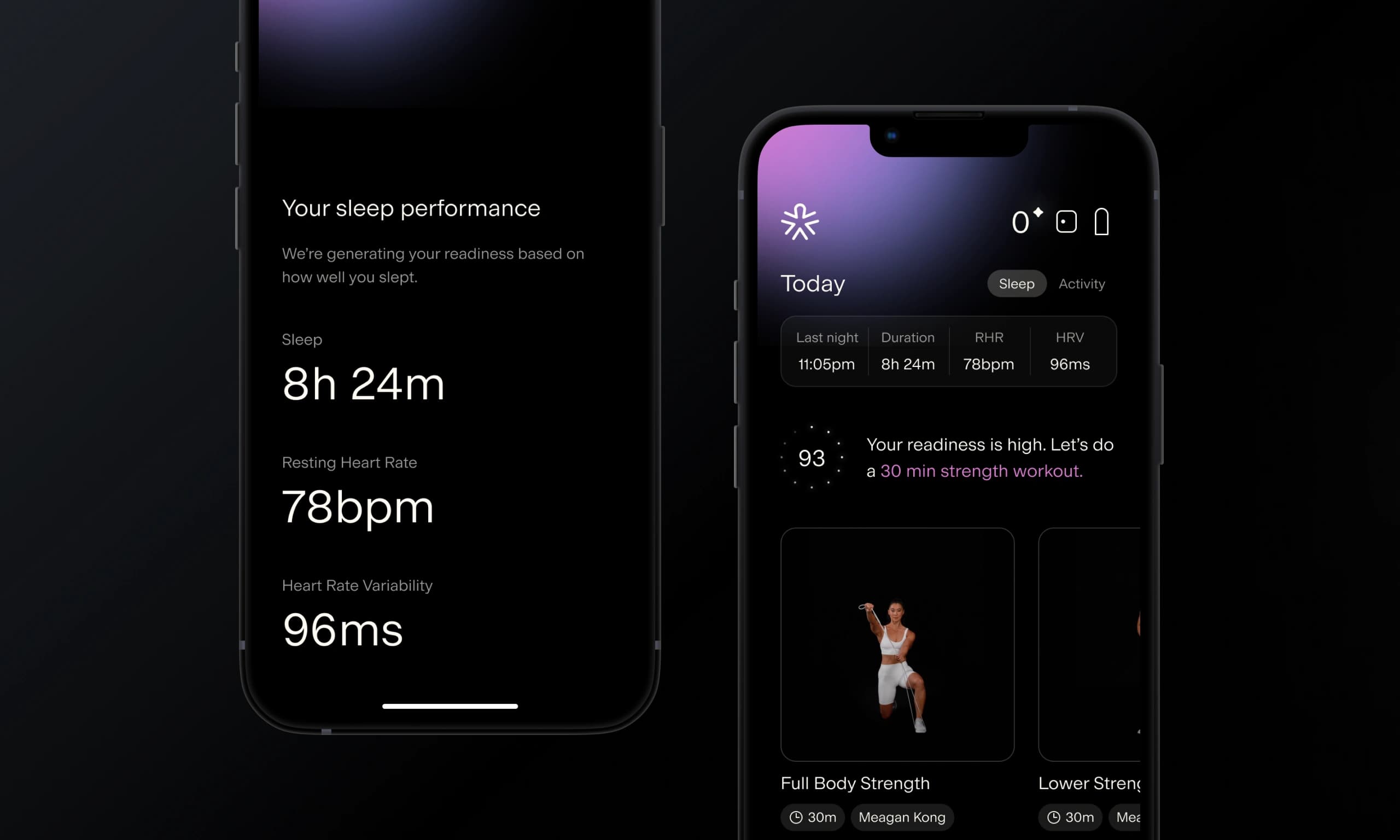 The static nature of the app led me to identify specific flows where animations could be added to excite and motivate users. One key opportunity was the morning sync—a daily event where the app syncs biometric data from the user’s wearable device to provide a readiness score. To create a "smart" feel and build suspense, I collaborated with the engineering team to animate the sleep data and readiness score as they count up. Additionally, I added subtle movement to the readiness gradient blob to make the app feel more dynamic as users navigate through it.